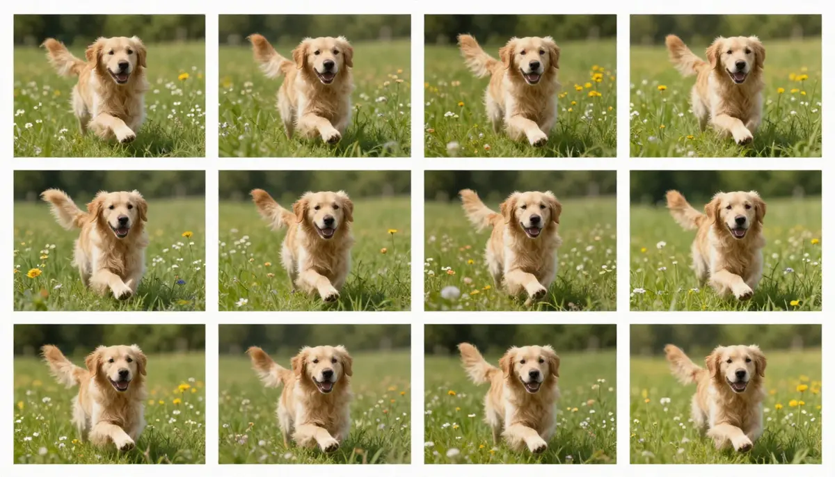 "A golden retriever puppy runs through a sunlit meadow with wildflowers, slow motion, shallow depth of field, warm golden hour lighting, cinematic quality"